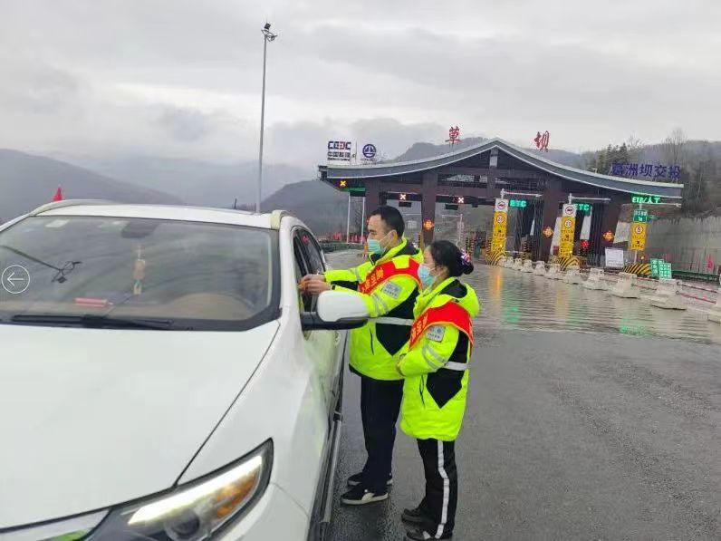 巴萬高速團支部兩位團員在雨中為過路司乘分發(fā)《通行指南》,協(xié)助解決道路事故等突發(fā)情況,為保通保暢貢獻青春力量。